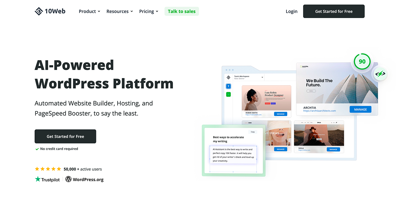Con más de 50,000 usuarios activos, 10Web ofrece acceso gratuito a sus herramientas sin necesidad de tarjeta de crédito y es confiable para numerosas empresas y agencias.