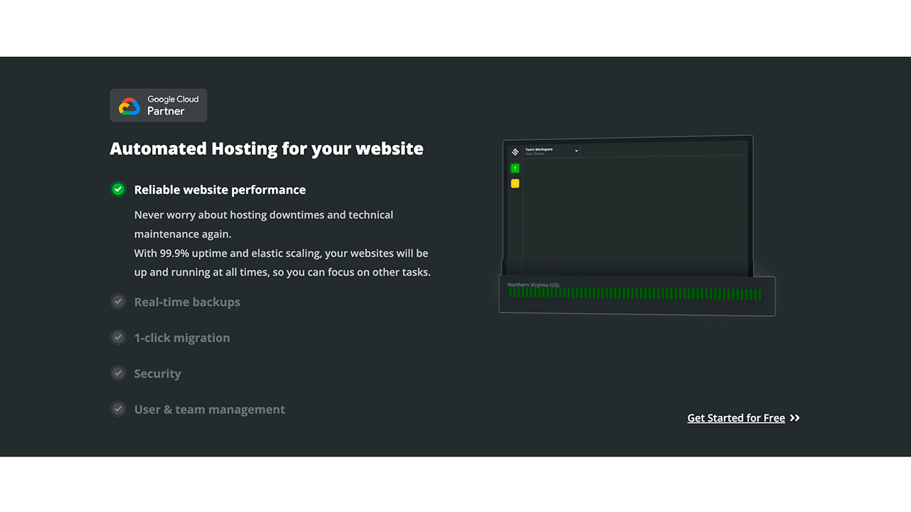 - Alojamiento de WordPress automatizado: Alojamiento rápido y totalmente automatizado impulsado por Google Cloud.
