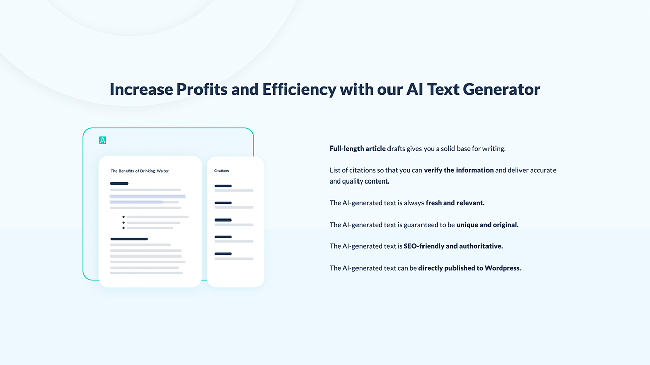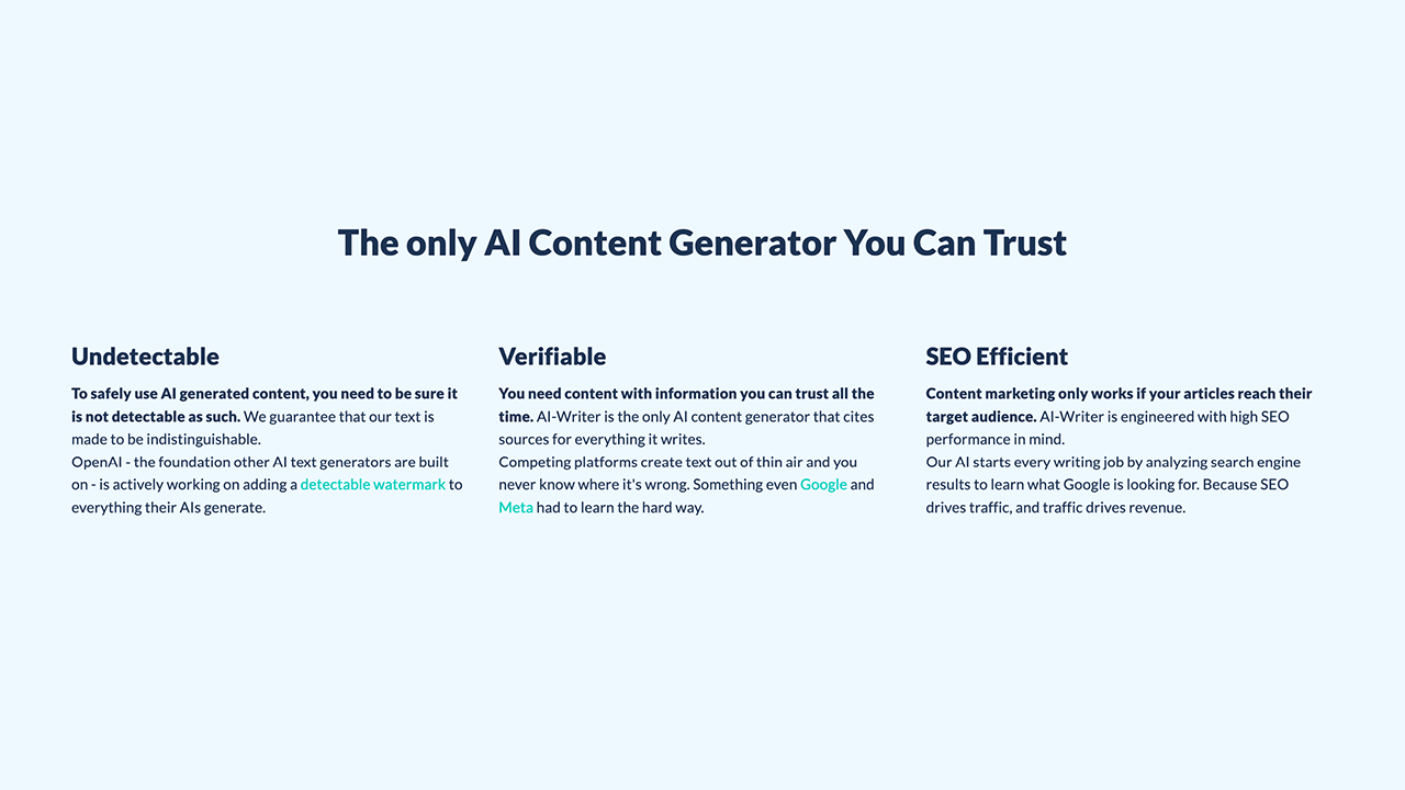 AI-Writer es la plataforma de generación de contenido más precisa, que utiliza modelos de escritura de inteligencia artificial de última generación para generar artículos con información que siempre puede verificar.