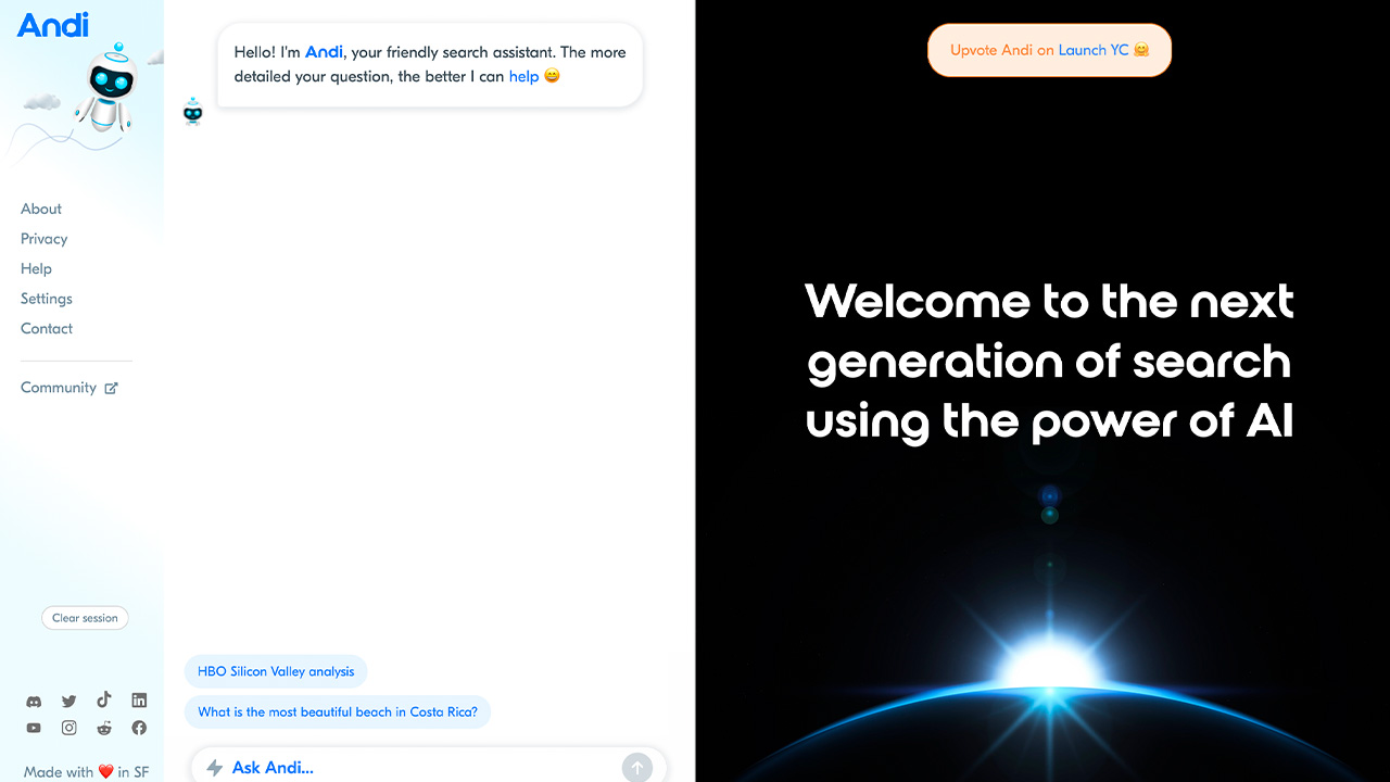 Andi se presenta como un asistente de búsqueda interactivo que te anima a hacer preguntas detalladas para obtener resultados más precisos. Ya sea que estés buscando información sobre modelos de moda, consejos de fitness o herramientas de inteligencia artificial sin código, Andi está aquí para ayudarte.