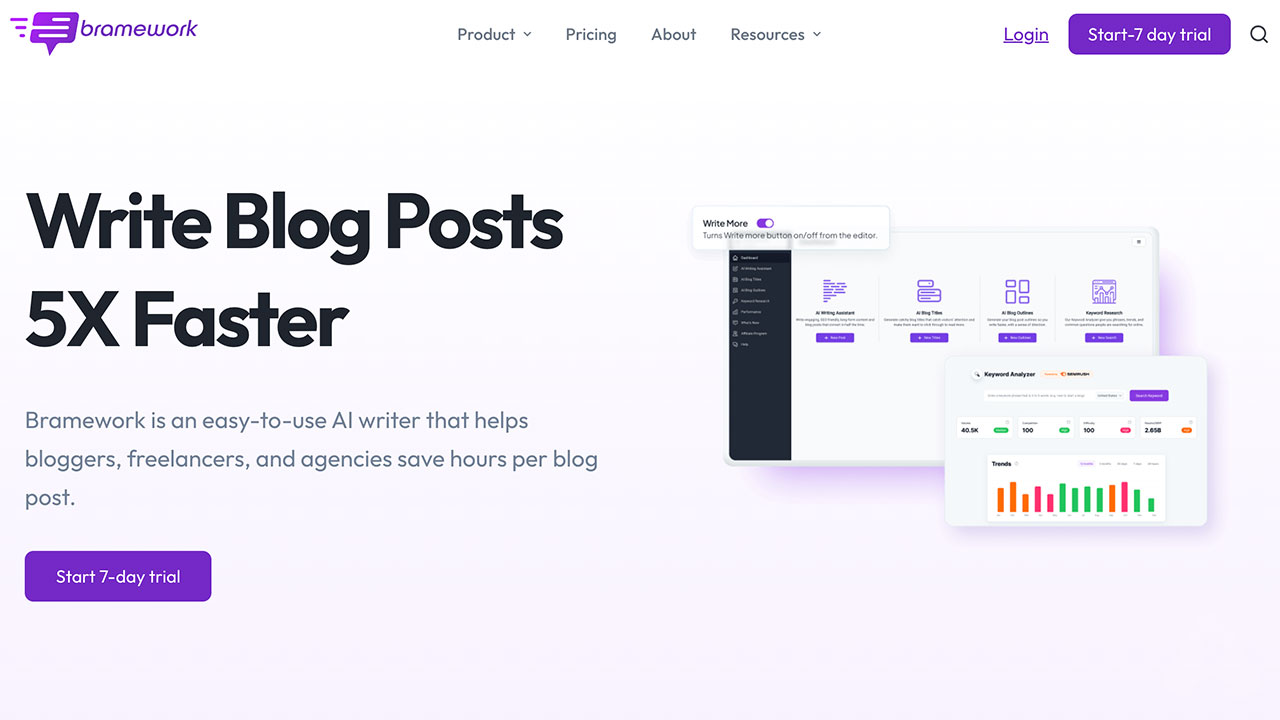 - Escritor de IA avanzado: Utilizando un procesamiento avanzado del lenguaje natural, el Escritor de IA de BrameWork toma tus ideas y genera rápidamente una publicación de blog de alta calidad con el tono, estilo y formato perfectos