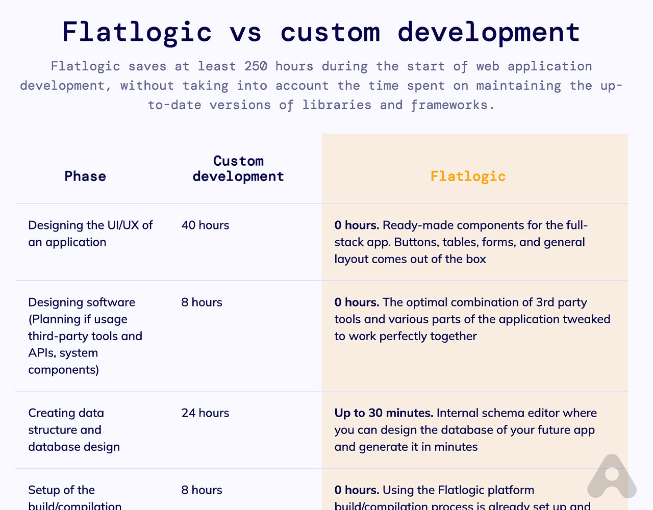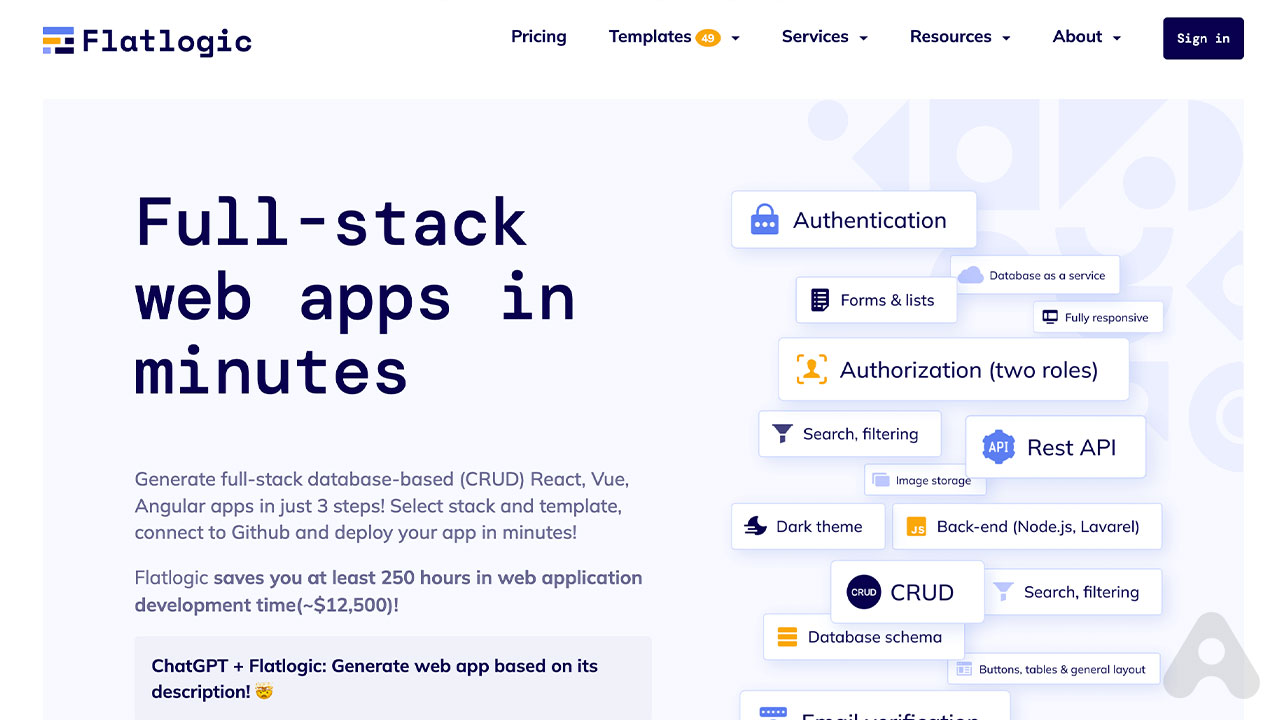 - Generación automática de esquemas: Flatlogic crea automáticamente un esquema de base de datos a partir de la descripción de la aplicación proporcionada por el usuario