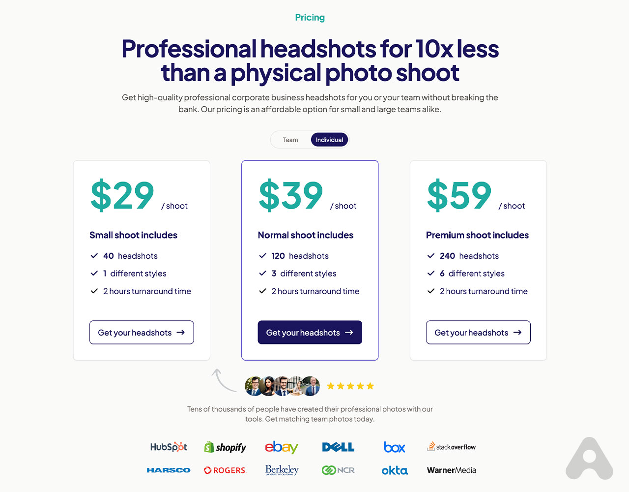 - Amplia selección de headshots: La plataforma ofrece más de 120+ retratos para elegir, con tres ubicaciones únicas y tamaños de foto en 4K