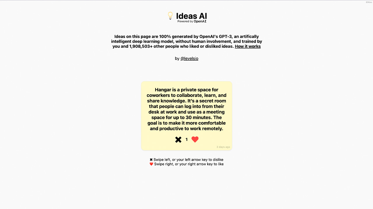 Ideas AI se describe a sí mismo como una plataforma que genera ideas de startups utilizando GPT-3 de OpenAI. Las ideas presentadas en la página son generadas al 100% por GPT-3 de OpenAI sin intervención humana. Estas ideas son entrenadas y calificadas por más de 1,765,990 personas que indican si les gusta o no una idea específica.