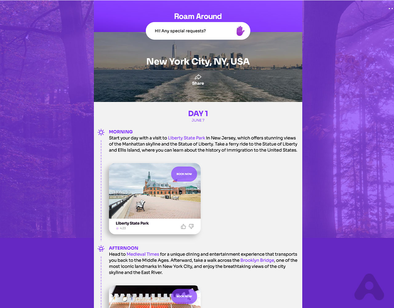 - Generación instantánea de itinerarios: Roam Around utiliza inteligencia artificial para crear al instante un itinerario personalizado para tu destino elegido